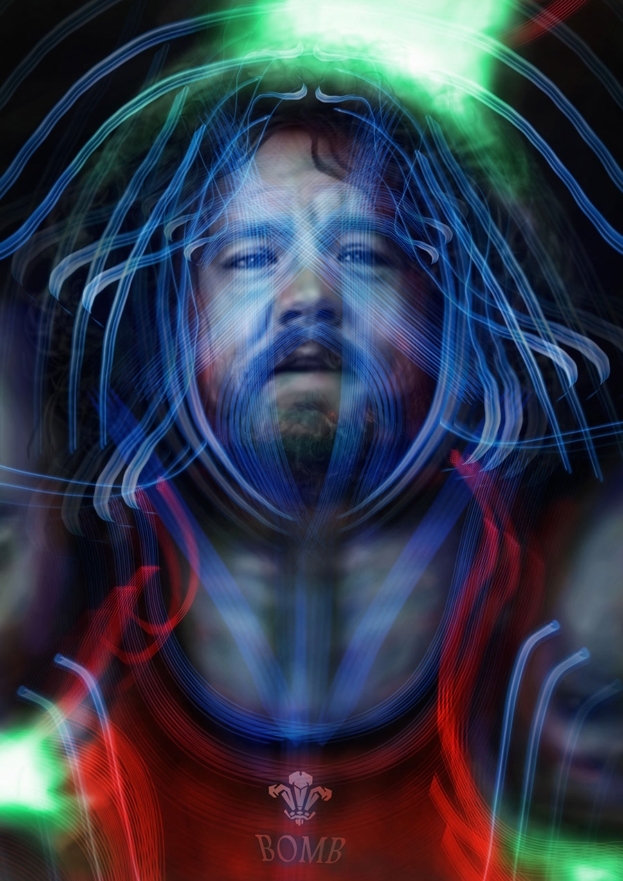 The artwork was made by using a combination of long exposure (light painting) photography and digital art techniques. This is the third piece from the project and features Wales rugby player - Tighthead Prop - Adam Jones.